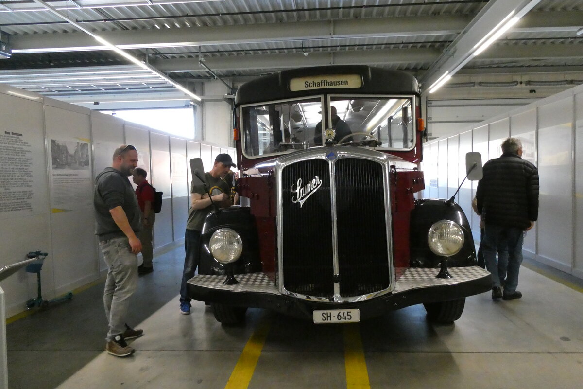 (286'101) - Borer, Neuhausen - SH 12'578 - Saurer/Tüscher (ex Schöttler, D-Köln; ex Braun, D-Münster; ex Schmid, Hemishofen; ex Brütsch, Büttenhard; ex ASS Schleitheim Nr. 8) am 11. April 2026 in Schaffhausen, Regionalbusgarage VBSH