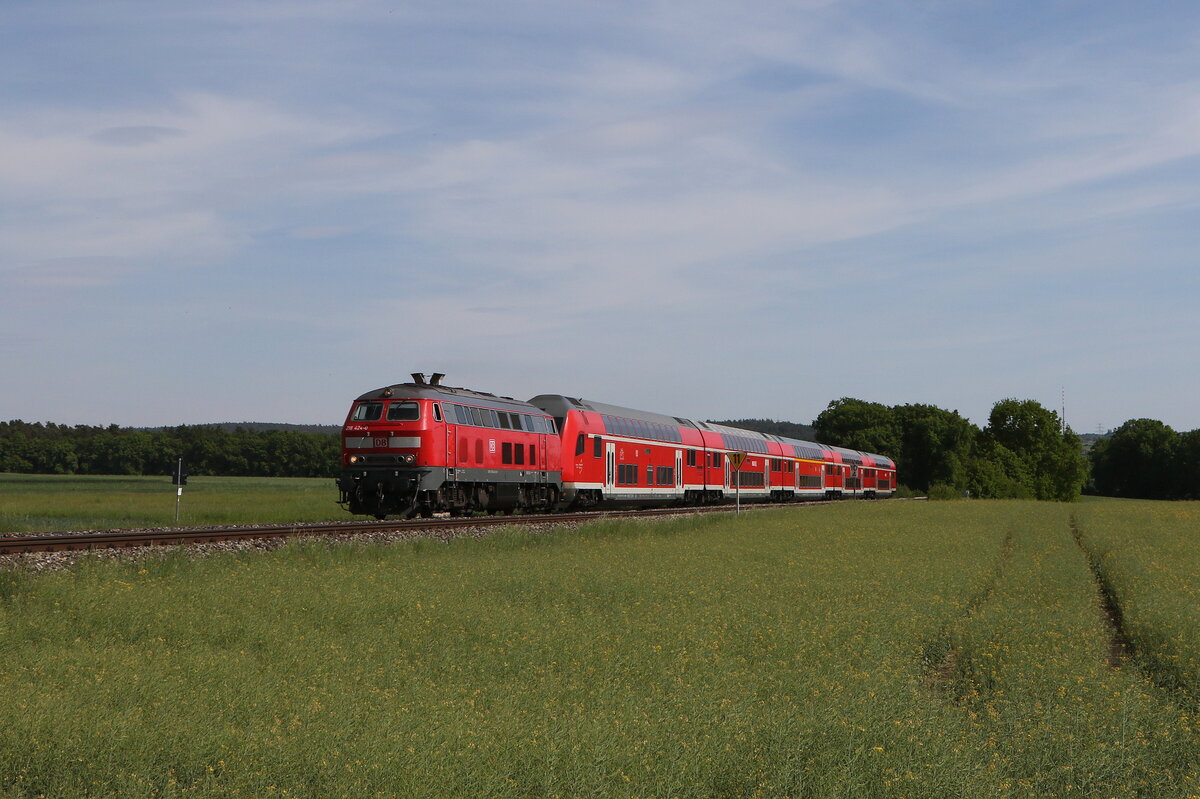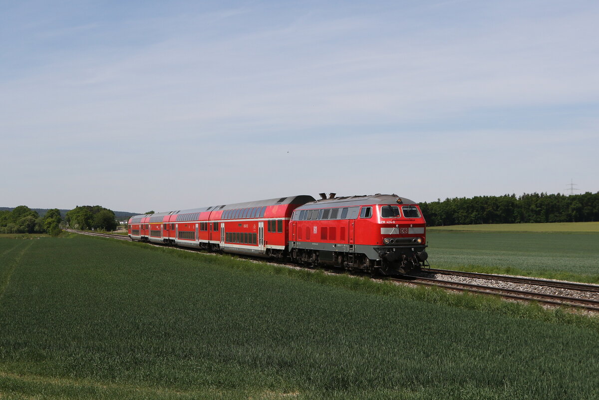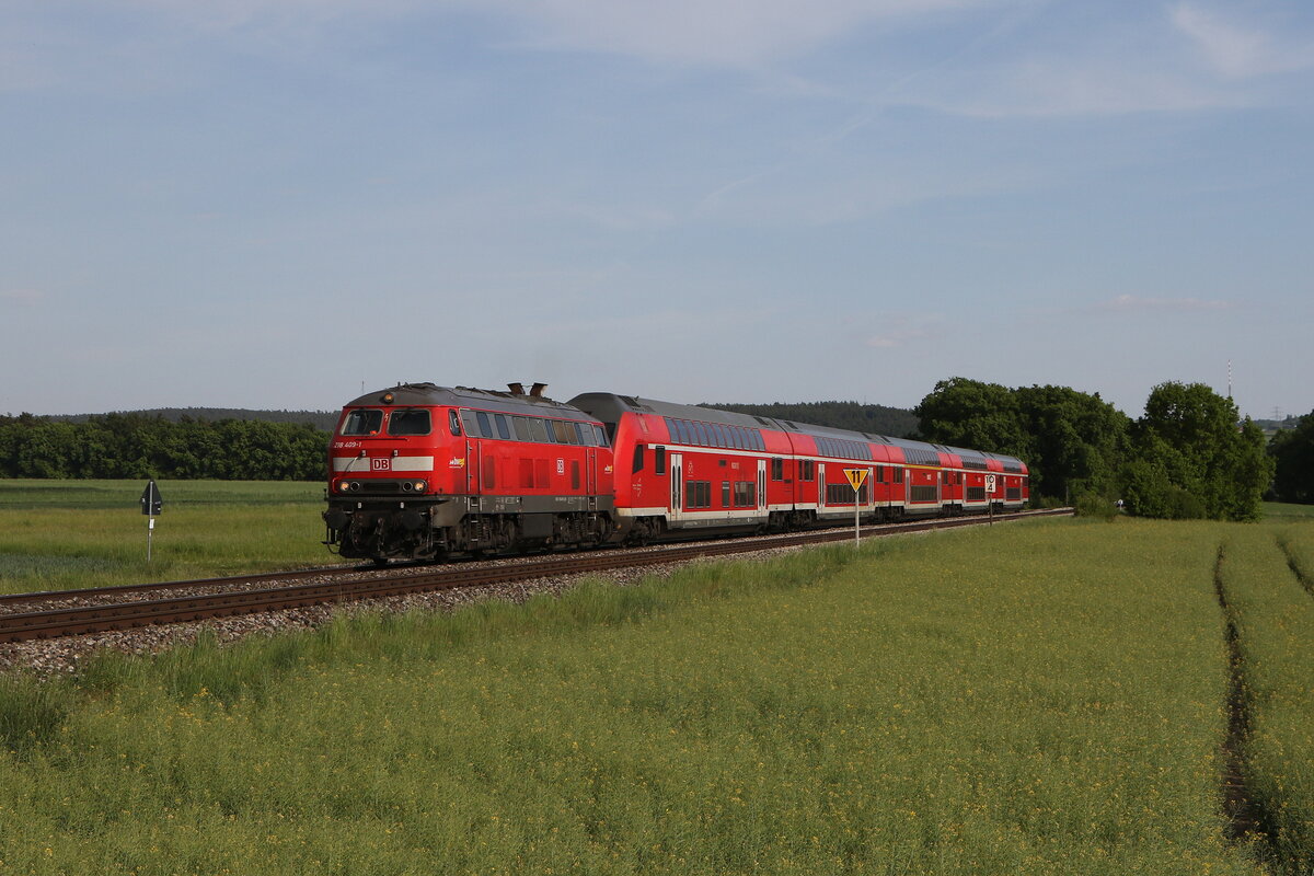 218 460 "Conny" von der "Westfrankenbahn" war am 21. November 2021 mit dem "IC Nebelhorn" bei "Riedles" im Allgäu in Richtung Augsburg unterwegs.