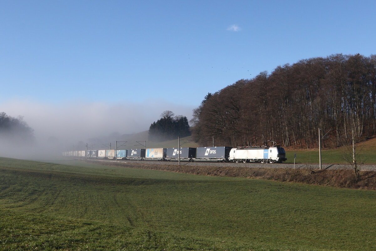 186 107 mit einem "KLV" am 23. Juli 2021 bei der Durchfahrt von Oberwels.