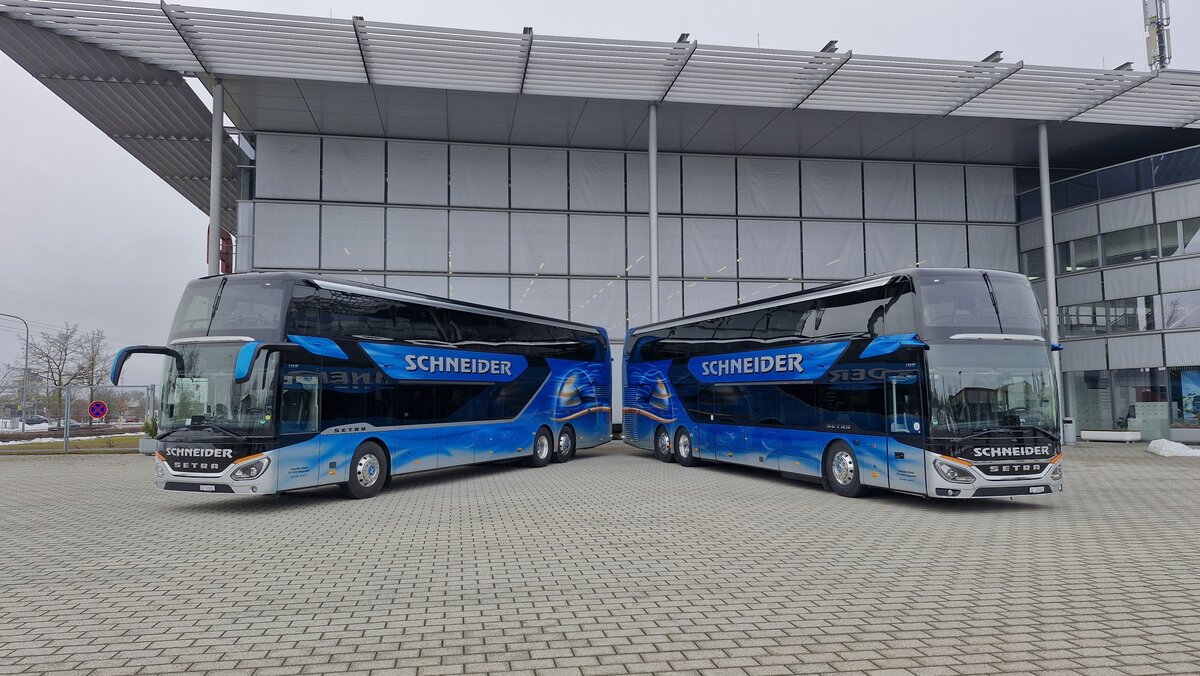 zweimal Setra S 531 DT, SO 20660 und SO 82002, in Neu-Ulm D, Setra Ablieferungszentrum, Schneider Reisen & Transport AG, Langendorf, Aufgenommen am 30. Januar 2026