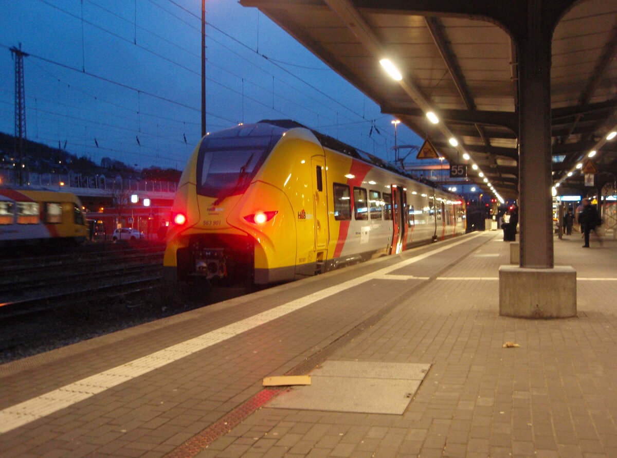 563 801 der Hessischen Landesbahn als RB 90 nach Siegen Hbf in Limburg (Lahn). 23.12.2025